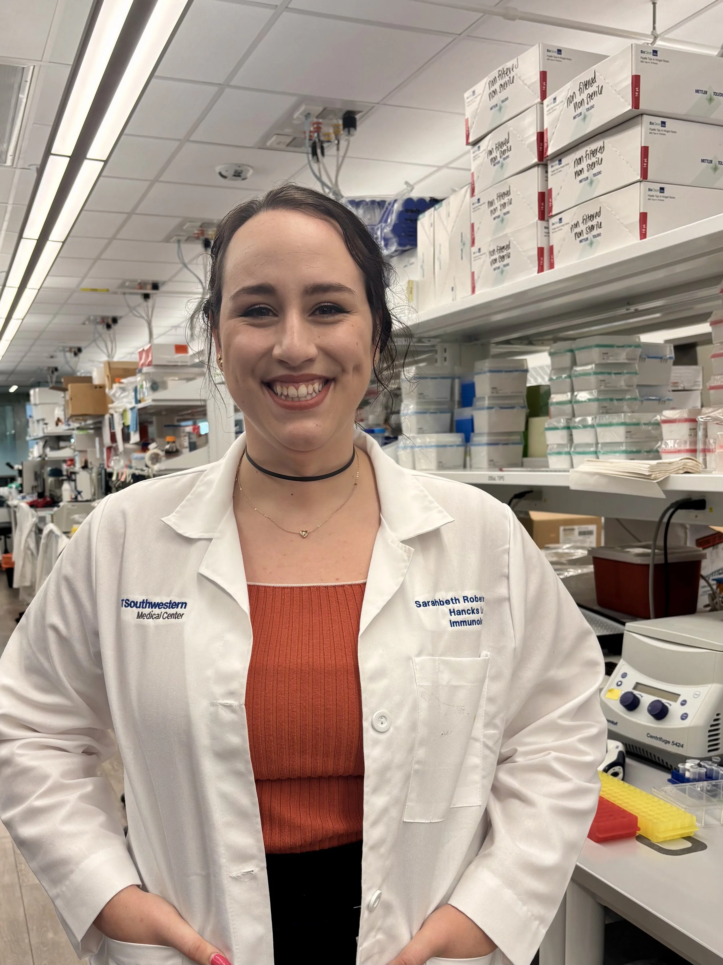 Sarahbeth joined the Hancks lab in Summer of 2022. Before coming to UTSW, her background includes work in emergency medicine, a clinical lab, and behavioral animal research in vivariums. When she’s not in the lab, Sarahbeth spends her free time exploring Dallas or curling up at home with her black cat Noire to read a good book.